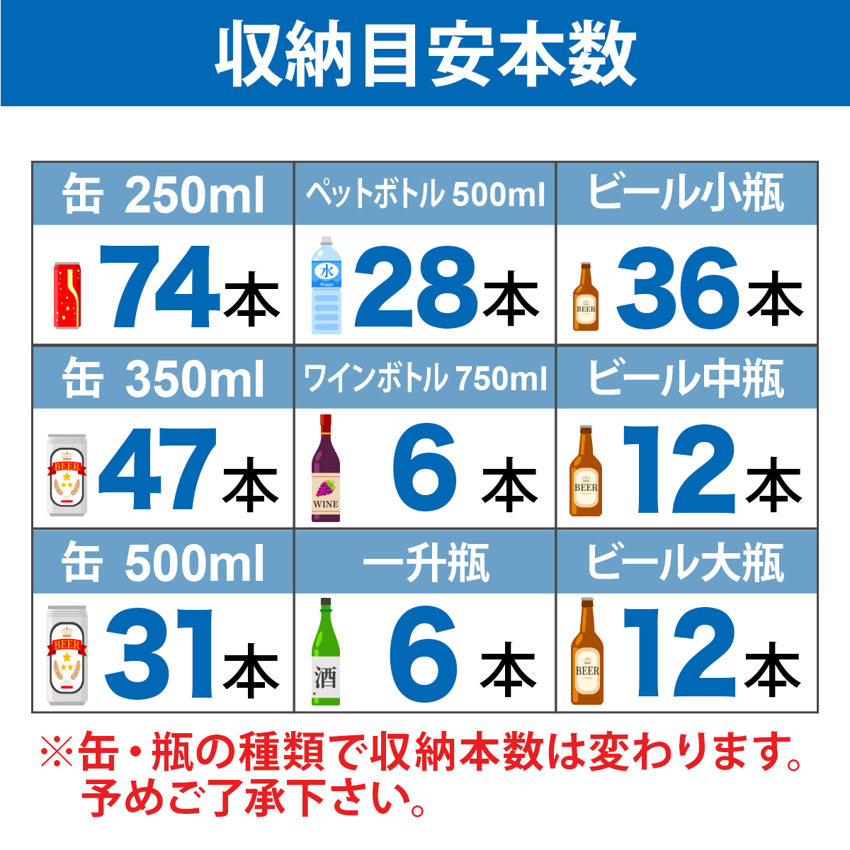 - 収納目安250ml缶:約74本 350ml缶:約47本 500mlPET:約28本