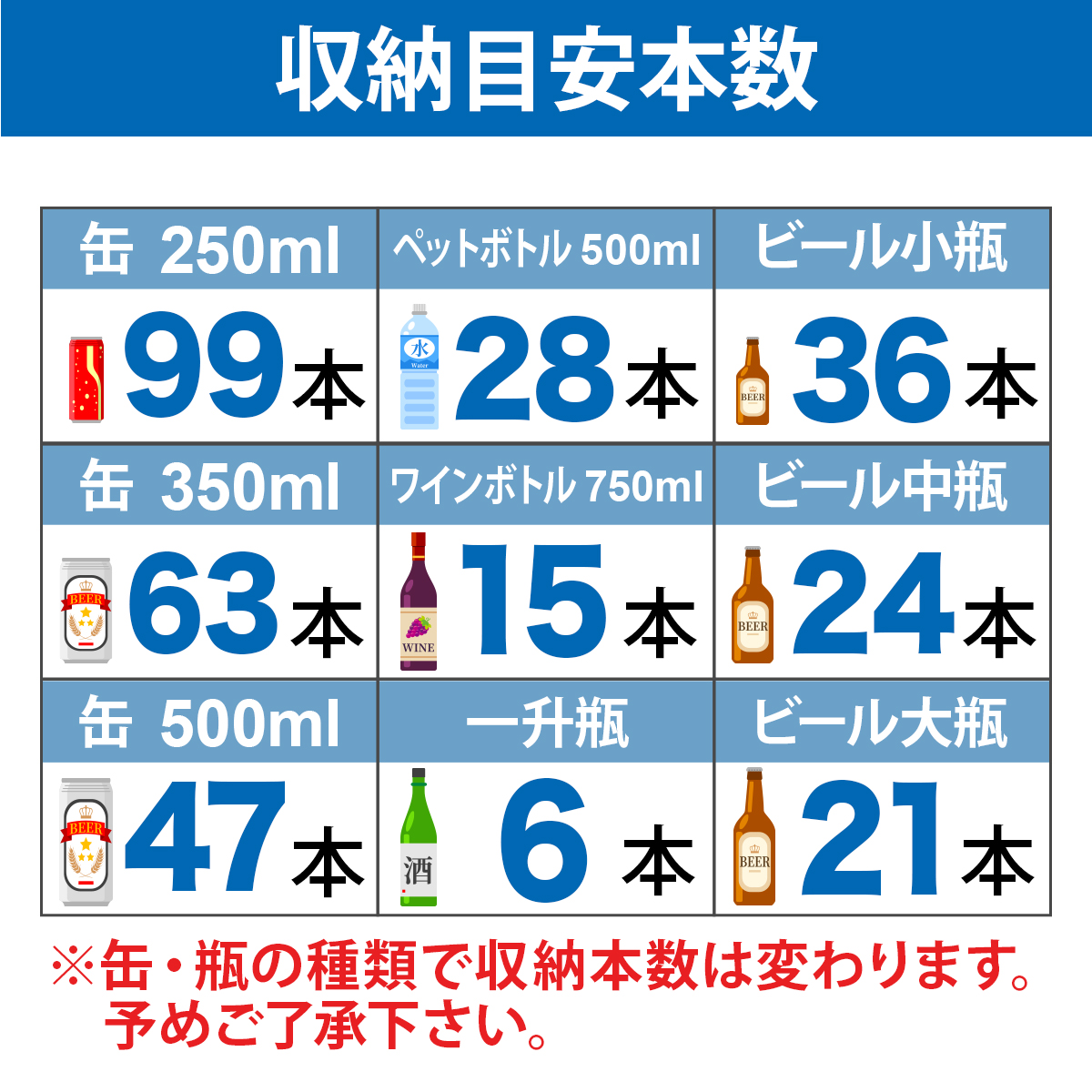 - 収納目安250ml缶:約99本 350ml缶:約63本 500mlPET:約28本