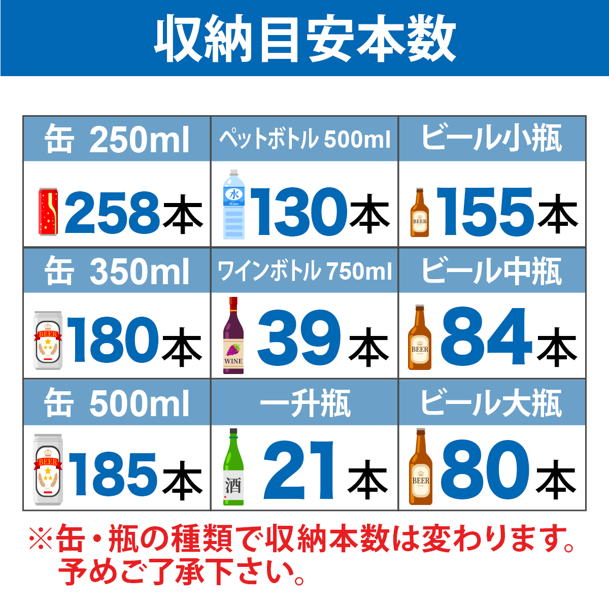 - 収納目安250ml缶:約258本 350ml缶:約180本 500mlペットボトル:約 130本