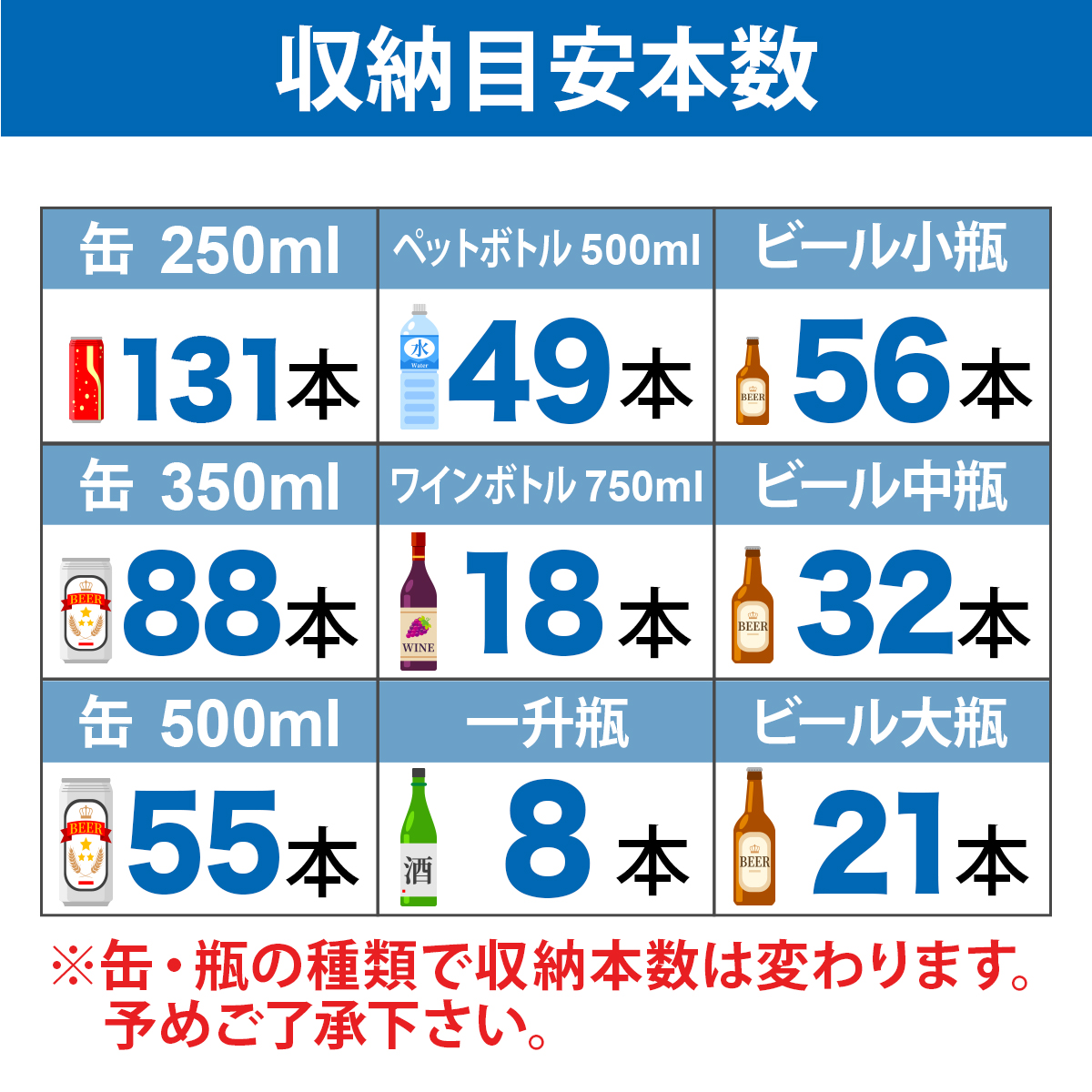 - 収納目安250㎖缶 :約131本 350㎖缶 :約88本 500㎖缶 :約55本 500mlPET:約49本 ワイン:約18本 ビール小瓶:約56本 ビール中瓶:約32本 ビール大瓶:約21本 一升瓶:約8本