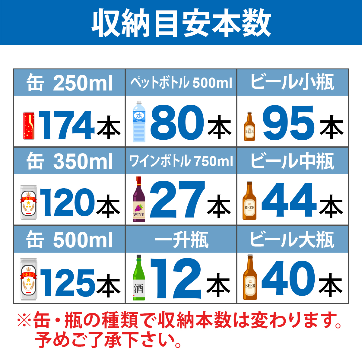- 収納目安250ml缶:約174本 350ml缶:約120本 500mlペットボトル:約 80本