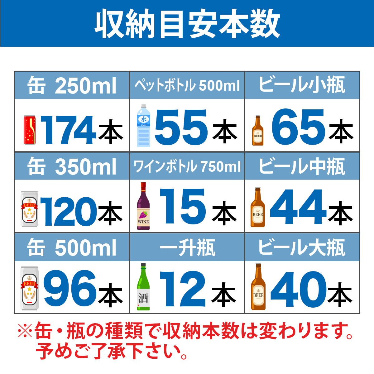 - 収納目安 250ml缶:約174本 350ml缶:約120本 500mlペットボトル:約55本