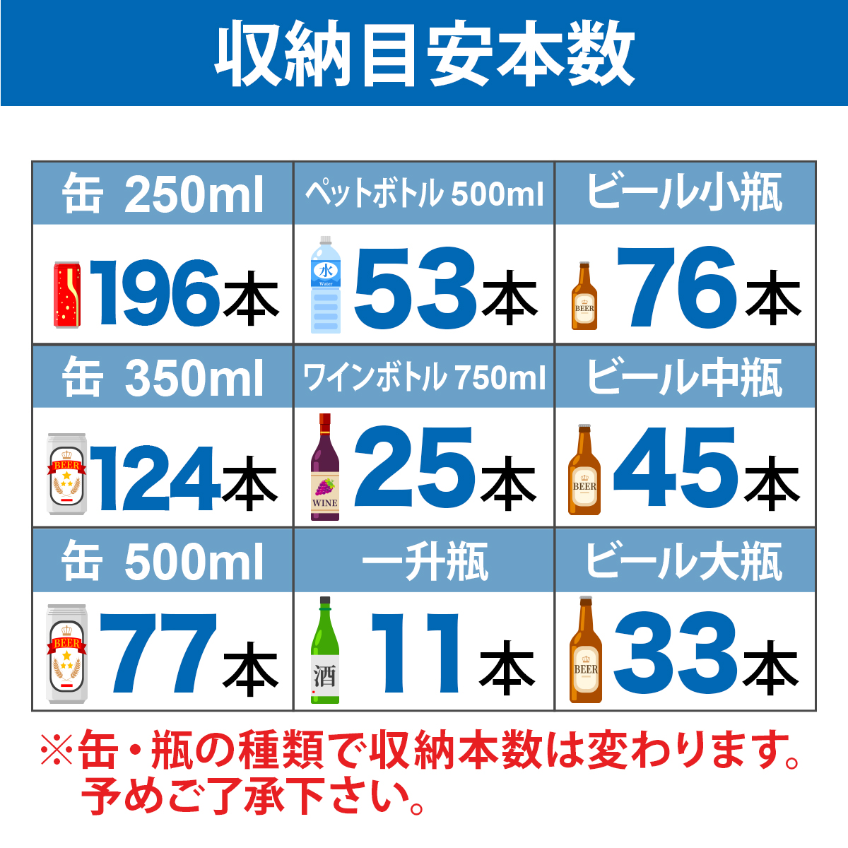 - 収納目安250㎖缶 :約196本 350㎖缶 :約124本 500㎖缶 :約77本 500mlPET:約53本 ワイン:約25本 ビール小瓶:約76本 ビール中瓶:約45本 ビール大瓶:約33本 一升瓶:約11本
