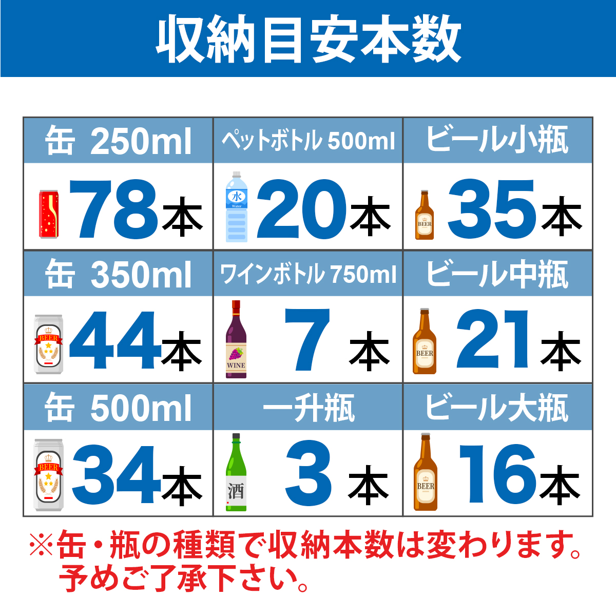 - 収納目安250㎖缶 :約78本 350㎖缶 :約44本 500㎖缶 :約34本 500mlPET:約20本 ワイン:約7本 ビール小瓶:約35本 ビール中瓶:約21本 ビール大瓶:約16本 一升瓶:約3本