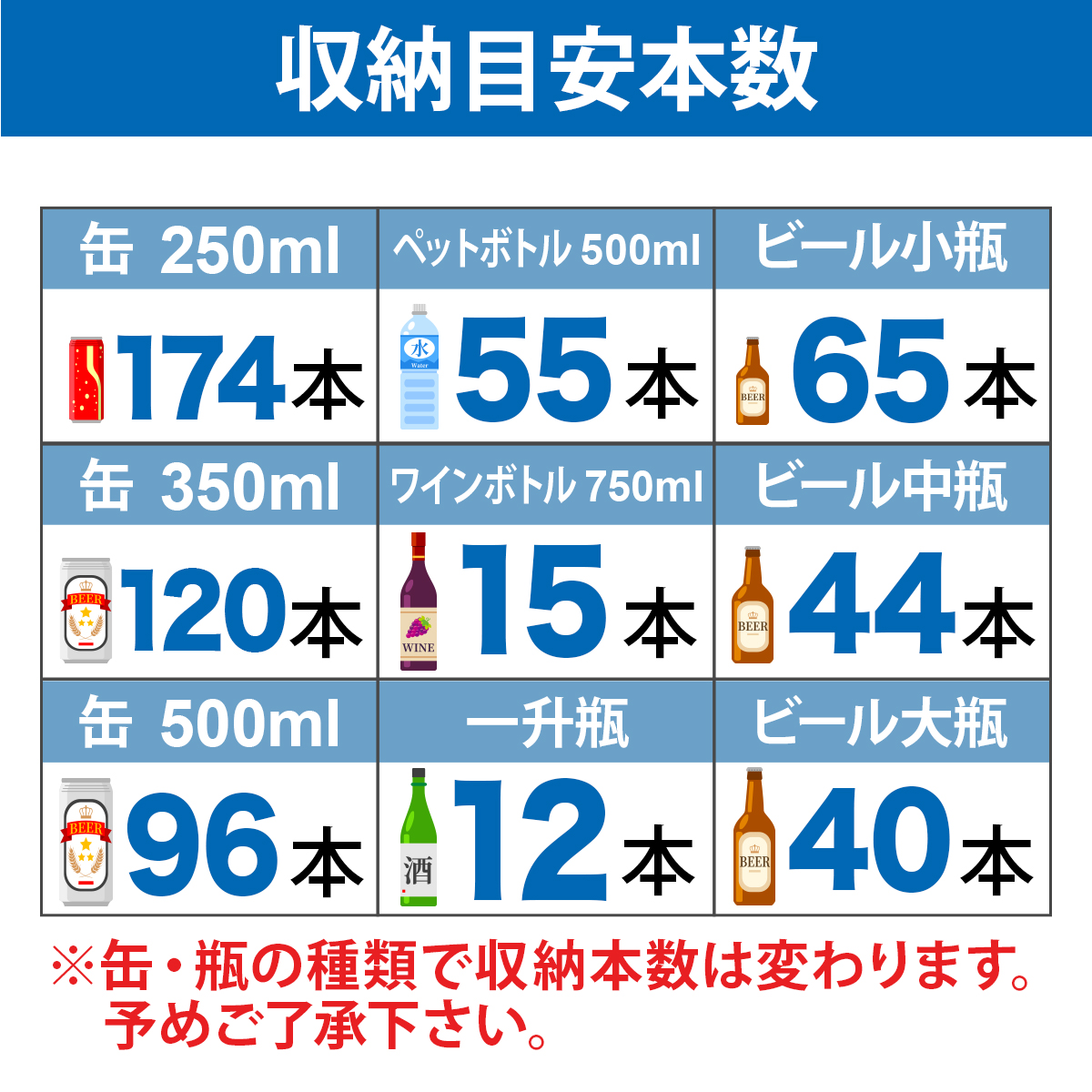 - 収納目安250ml缶:約174本 350ml缶:約120本 500mlペットボトル:約55本