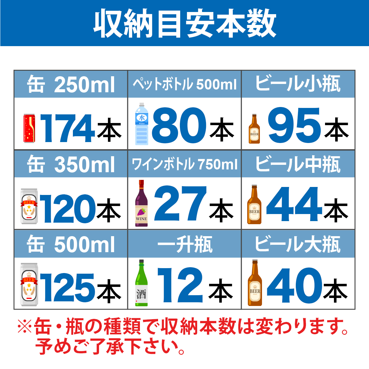 - 収納目安 250ml缶:約174本 350ml缶:約120本 500mlペットボトル:約80本