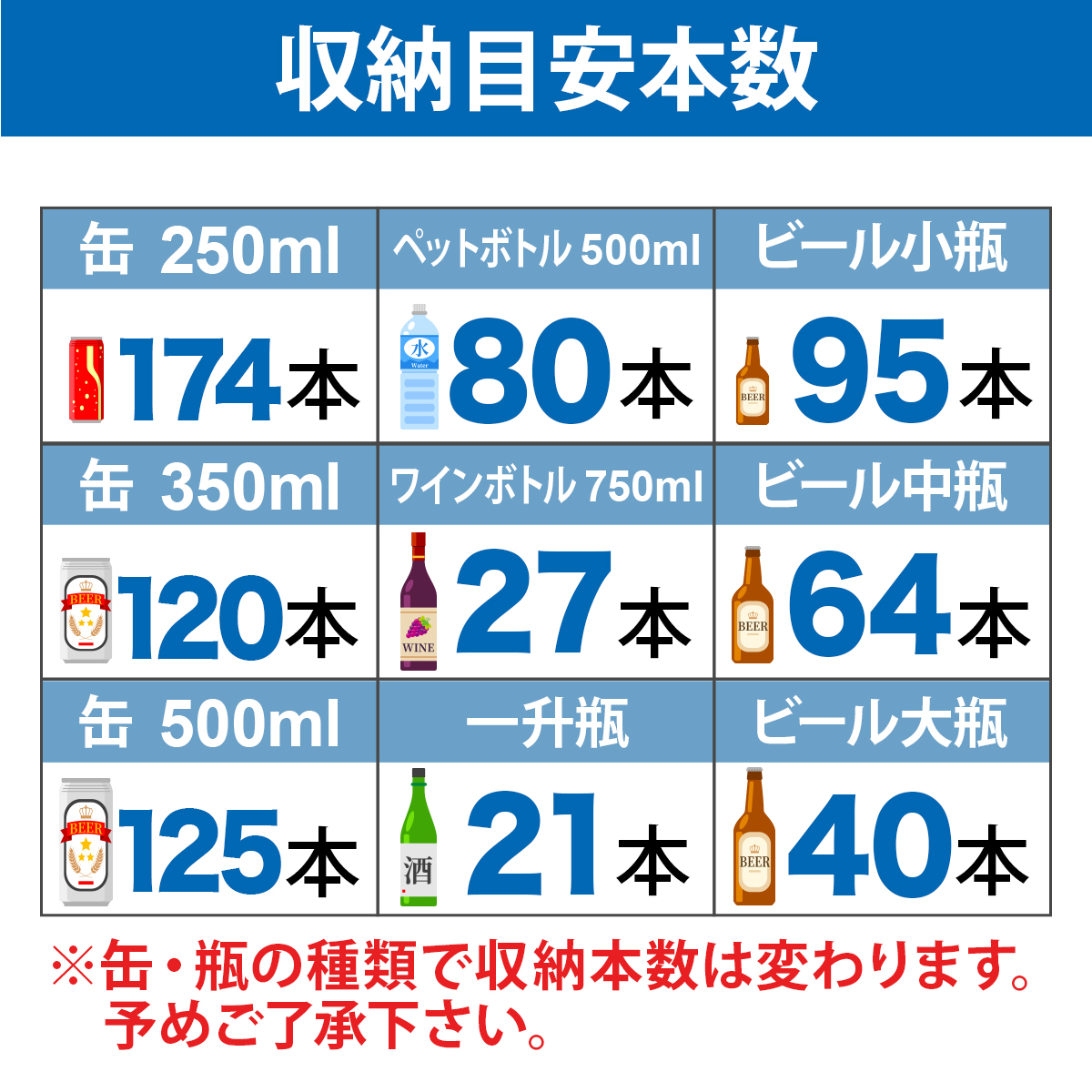- 収納目安 250ml缶:約174本 350ml缶:約120本 500mlペットボトル:約80本
