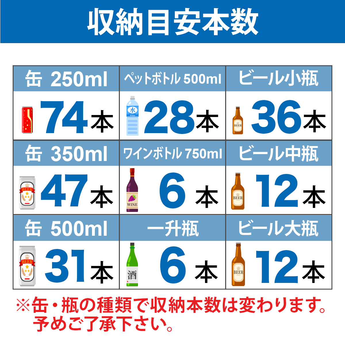 - 収納目安 250ml缶:約74本 350ml缶:約47本 500mlPET:約28本