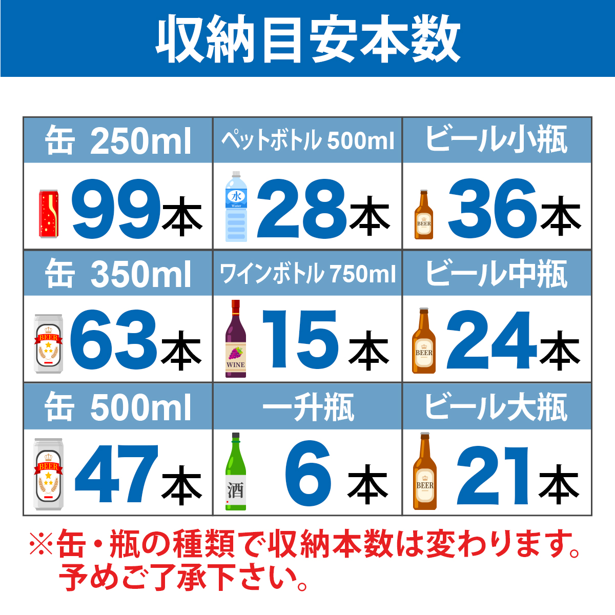 - 収納目安 250ml缶:約99本 350ml缶:約63本 500mlPET:約28本