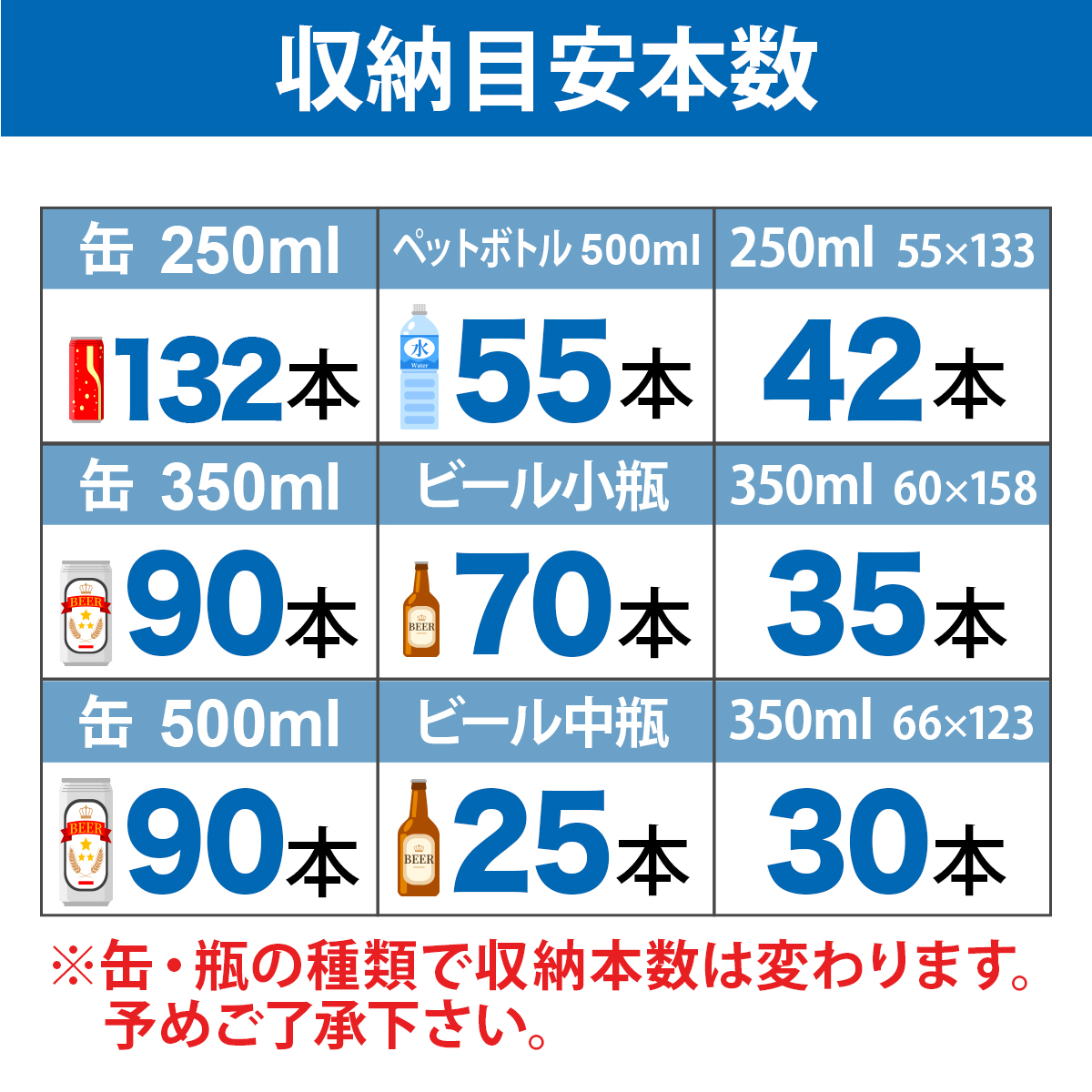 - 収納目安冷蔵/加温 250ml缶:約132本 500ml缶:約90本 500mlPET:約55本 ビール大瓶:約20本 一升瓶:約12本 ワイン:約20本