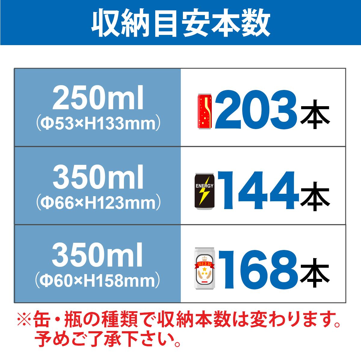 - 収納目安250ml(Φ53×H133mm):約203本 350ml(Φ60×H158mm):約168本 350ml(Φ66×H123mm):約144本