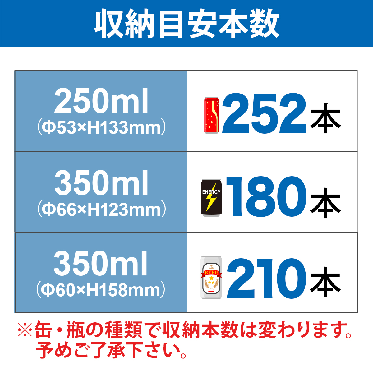 - 収納目安250ml(Φ53×H133mm):約252本 350ml(Φ60×H158mm):約210本 350ml(Φ66×H123mm):約180本