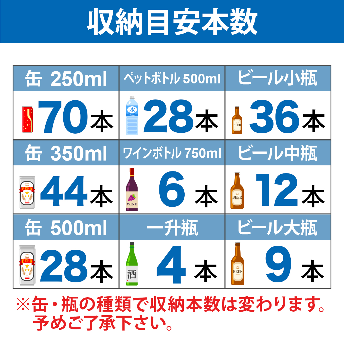 - 収納目安250ml缶:70本 350ml缶:44本 500mlペットボトル:28本